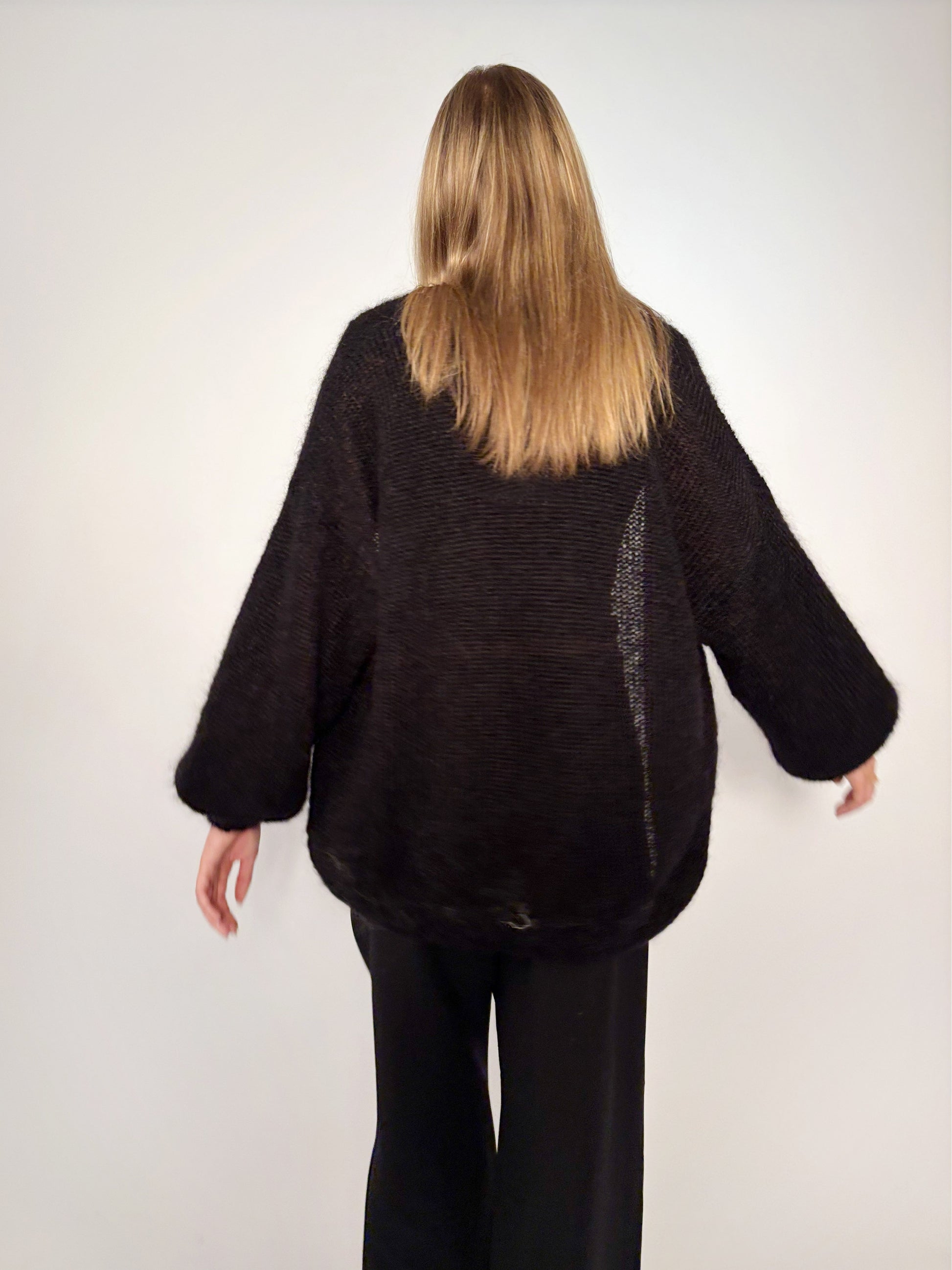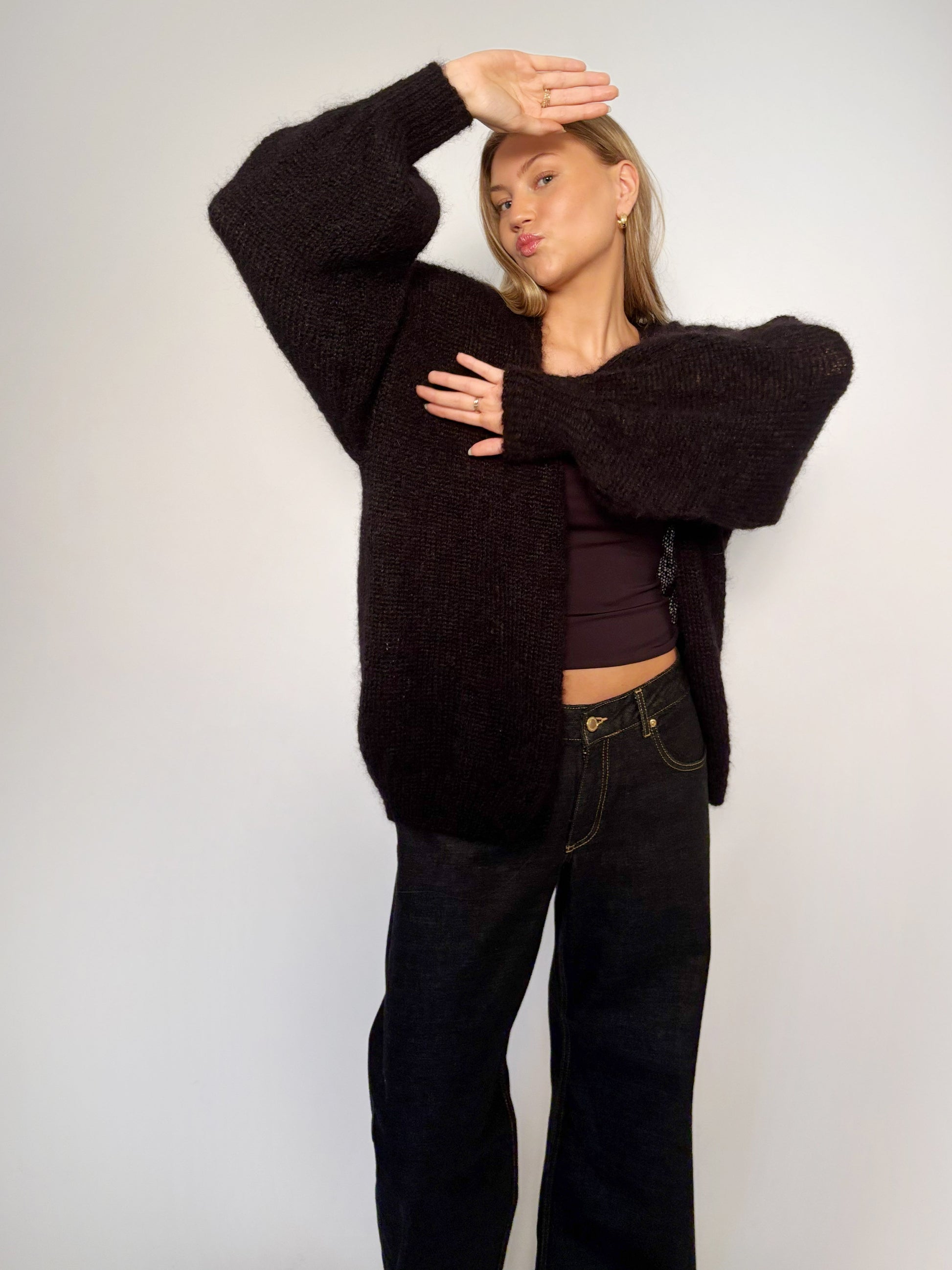 Wrap yourself in warmth and softness — this relaxed, buttonless cardigan is the ultimate cozy layer for everyday luxury. Knitted from our signature Kid Mohair blend in a mid-weight texture, it feels light yet deliciously fluffy, with a beautifully relaxed drape and voluminous balloon sleeves.