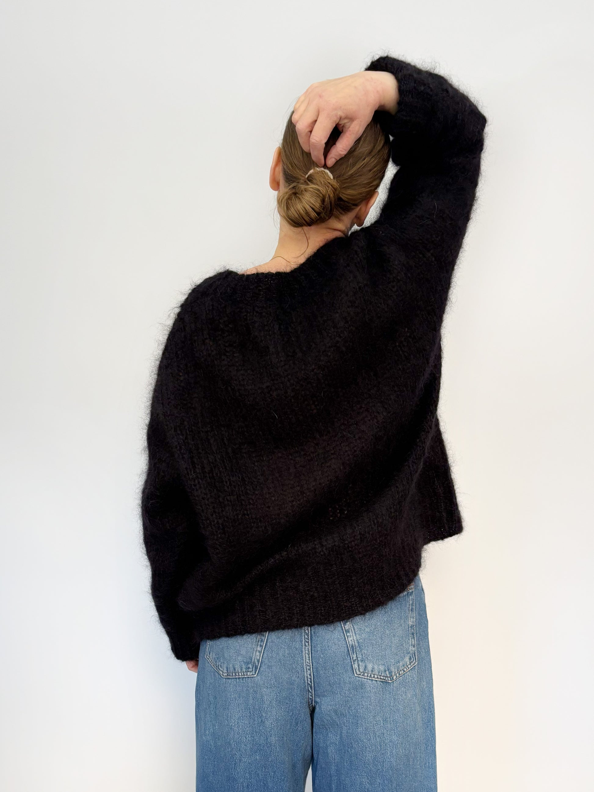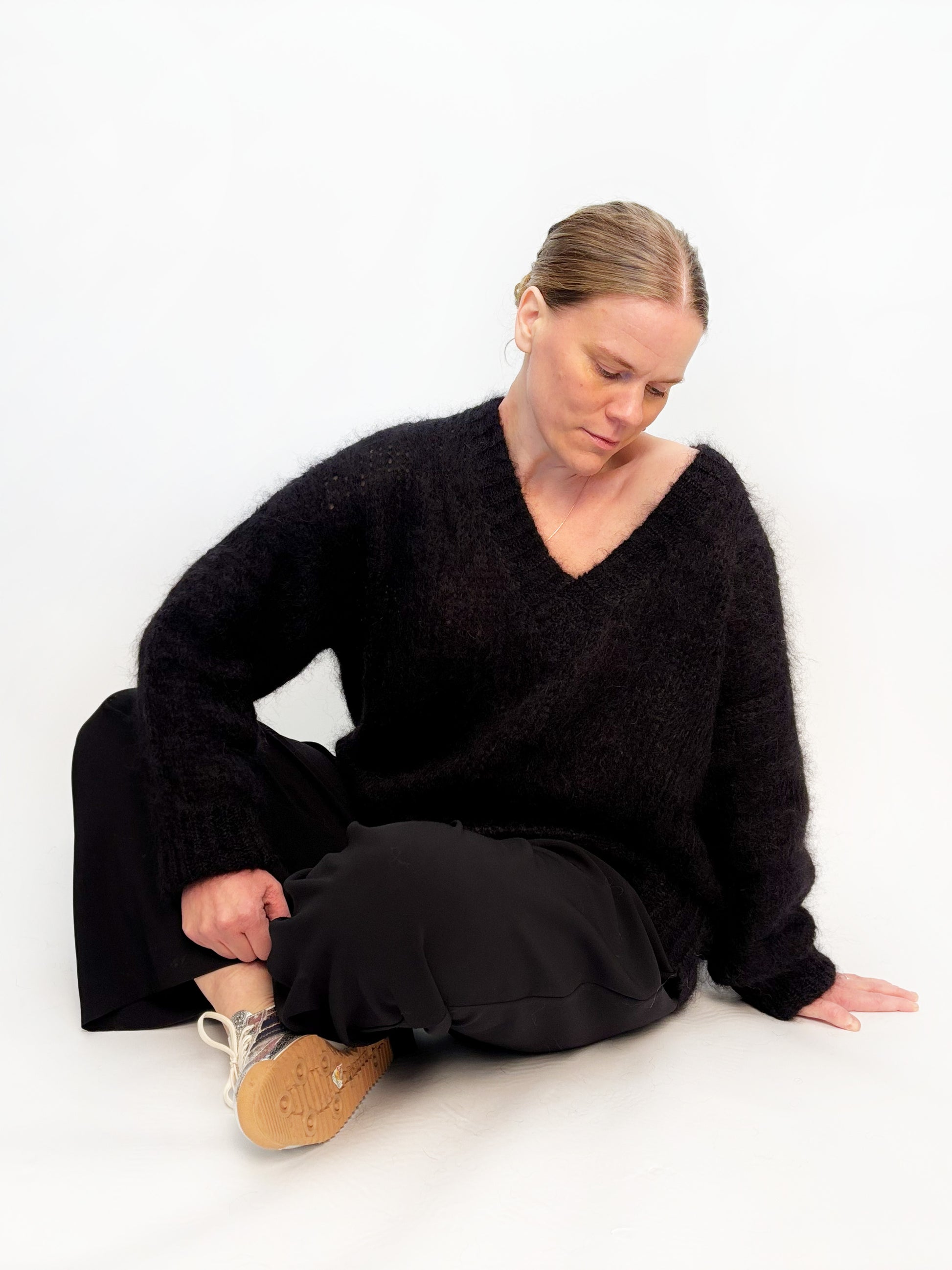 A relaxed, super oversized V-neck sweater in our signature Kid Mohair blend – deliciously fluffy, soft on the skin, and effortlessly feminine. Designed with a large V neckline and softly rolled-up sleeves for that easy, undone elegance. This is the coziest thing in the world. It’s perfectly comfortable but elegant for any occasion, your perfect trusted partner. ♥